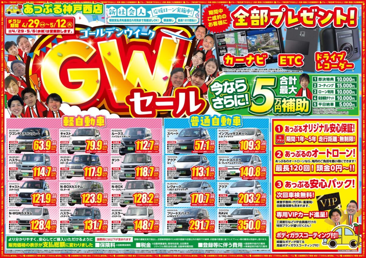 あっぷる各店合わせてグループ総在庫700台以上。国産車から輸入車まで様々な良質車を多数取り扱っております。幅広いラインナップの中から唯一無二の1台をお選びください。 ご希望の商品が無い場合は是非ご相談ください。