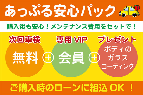購入後も安心。次回車検無料、専用VIP会員、ガラスコーティング付のお得なパック。